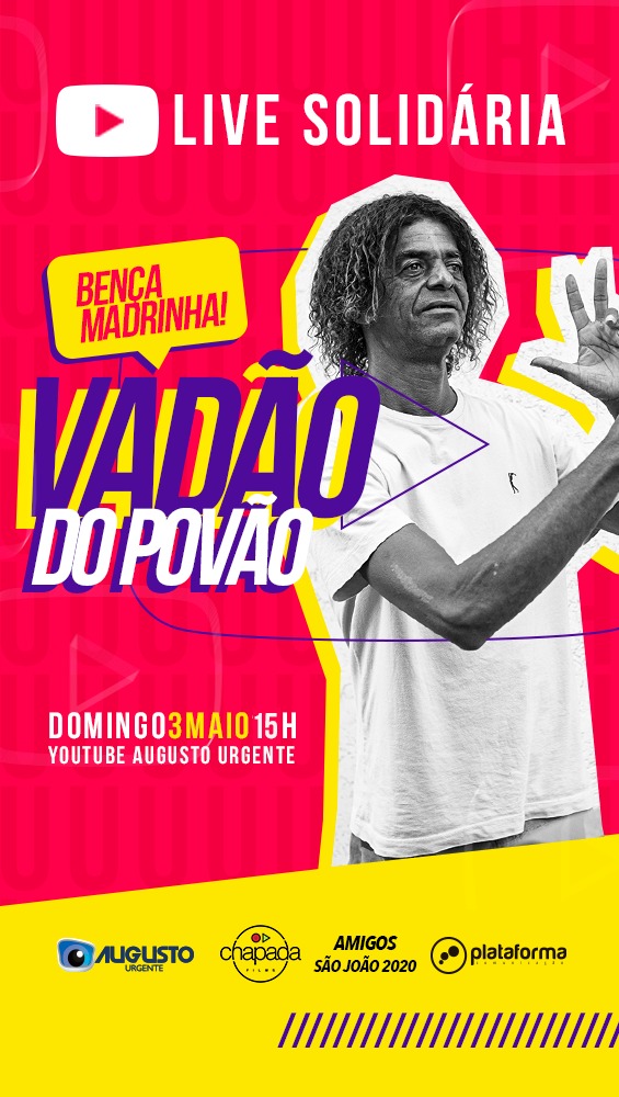 No próximo domingo, 03 de maio de 2020, o cantor Vadão do Povão estará realizando a sua Live Solidária, direto de Jacobina. A apresentação vai ao ar a partir das 15h no Facebook e You Tube.