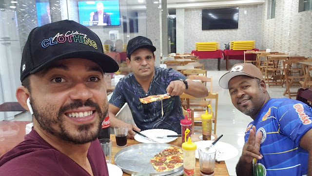 O trio que acabou de chegar de Seabra, onde estiveram transmitindo uma Live Solidária, aprecia um delicioso pizza.