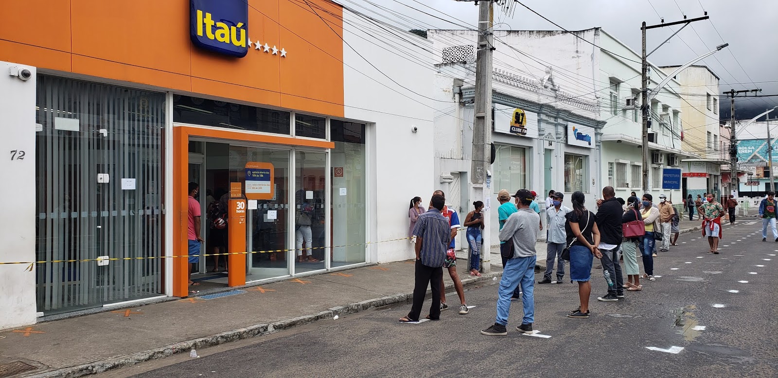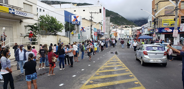 Na manhã desta quarta-feira, 06 de maio de 2020, pessoas seguem em filas bem organizadas para a agência da Caixa em Jacobina, mantendo o distanciamento recomendado pelos órgãos de saúde, para prevenir o contágio do Covid-19.