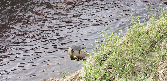 Uma tartaruga tomando sol em cima de uma pedra chama a atenção das pessoas que passam pelo local. Acreditamos que ela tenha vindo arrastada pelas águas da nascente do rio, que fica na região da Serra da Macaqueira, seguindo pelo Bairro do Leader.