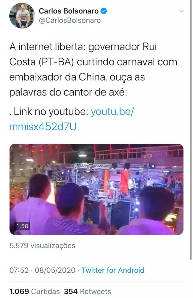 O vereador compartilhou o vídeo como se Bell estivesse se referindo ao novo coronavírus, no Carnaval deste ano. Contudo, o registro é da festa de 2017, e o artista se referia ao Zica vírus. “A internet liberta: governador Rui Costa (PT-BA) curtindo o carnaval com embaixador da China. Ouça as palavras do cantor de axé”, escreveu Carlos, antes de apagar o tweet.