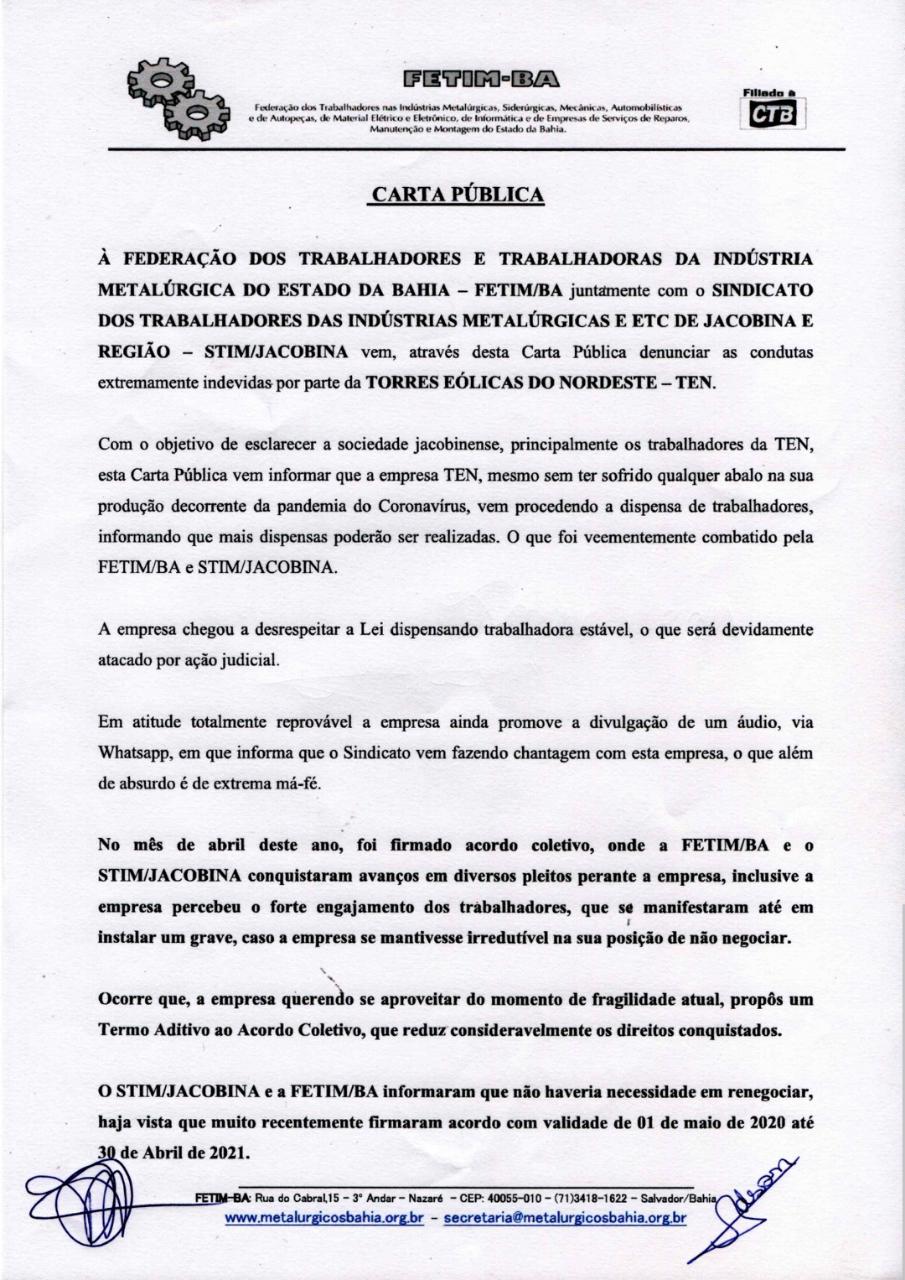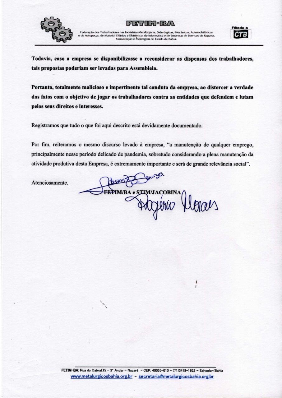 No mesmo dia 08, o sindicato respondendo a empresa: Reiteramos que a manutenção dos empregos é extremamente importante, principalmente nesse periodo delicado de Pandemia, sobretudo considerando a plena manutenção das atividades produtiva desta empresa, é extremamente importante e será de grande relevãncia social e que sejam reconsiderada as demissões e garantia dos empregos de todos os trabalhadores desta empresa.