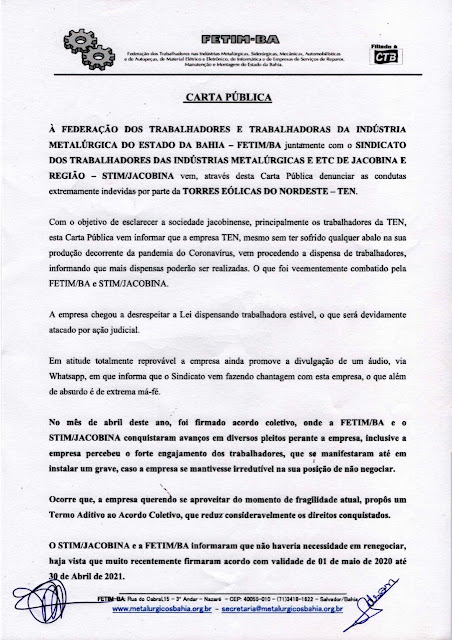 Companheiros e Companheiras, reiteramos todas as informações postada nos grupos de WhatsApp dos nossos representados, tudo isso com o objetivo de informar-los das ações arbritarias pela TEN. Torres Eólicas do Nordeste.