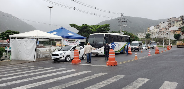 A equipe realiza a aferição da temperatura corporal de condutores e passageiros. Os transportes intermunicipais estão impedidos de entrarem na cidade. Quem insistir poderá ser multado.