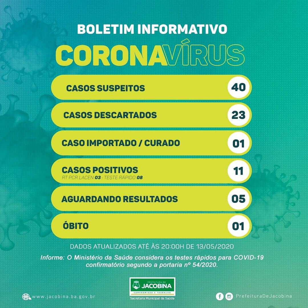 Nesta quarta-feira, 13 de maio de 2020, o município de Jacobina chega a 11 casos positivos de Covid-19, sendo 5 a mais do que na última atualização.