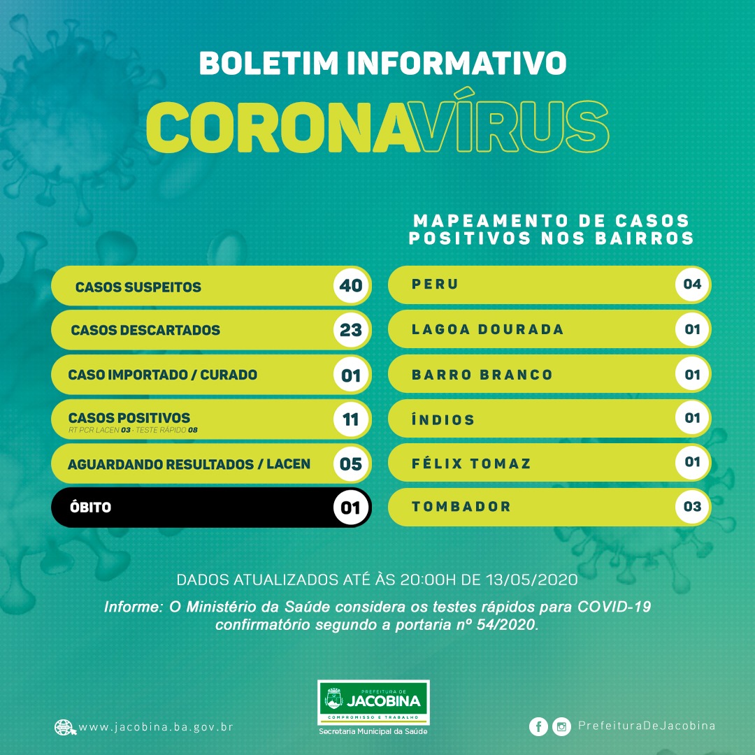 Na noite desta quarta-feira, 13 de maio de 2020, a Secretaria de Saúde do município de Jacobina divulgou um informativo com um mapeamento dos bairros com maior incidência de contaminação por Covid-19, o novo Coronavírus.