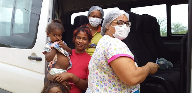 Nesta sexta-feira, 15 de maio de 2020, Cassia Barbosa juntamente com colega seguem realizando a vacinação de crianças nos bairros do Distrito de Caatinga do Moura, município de Jacobina.