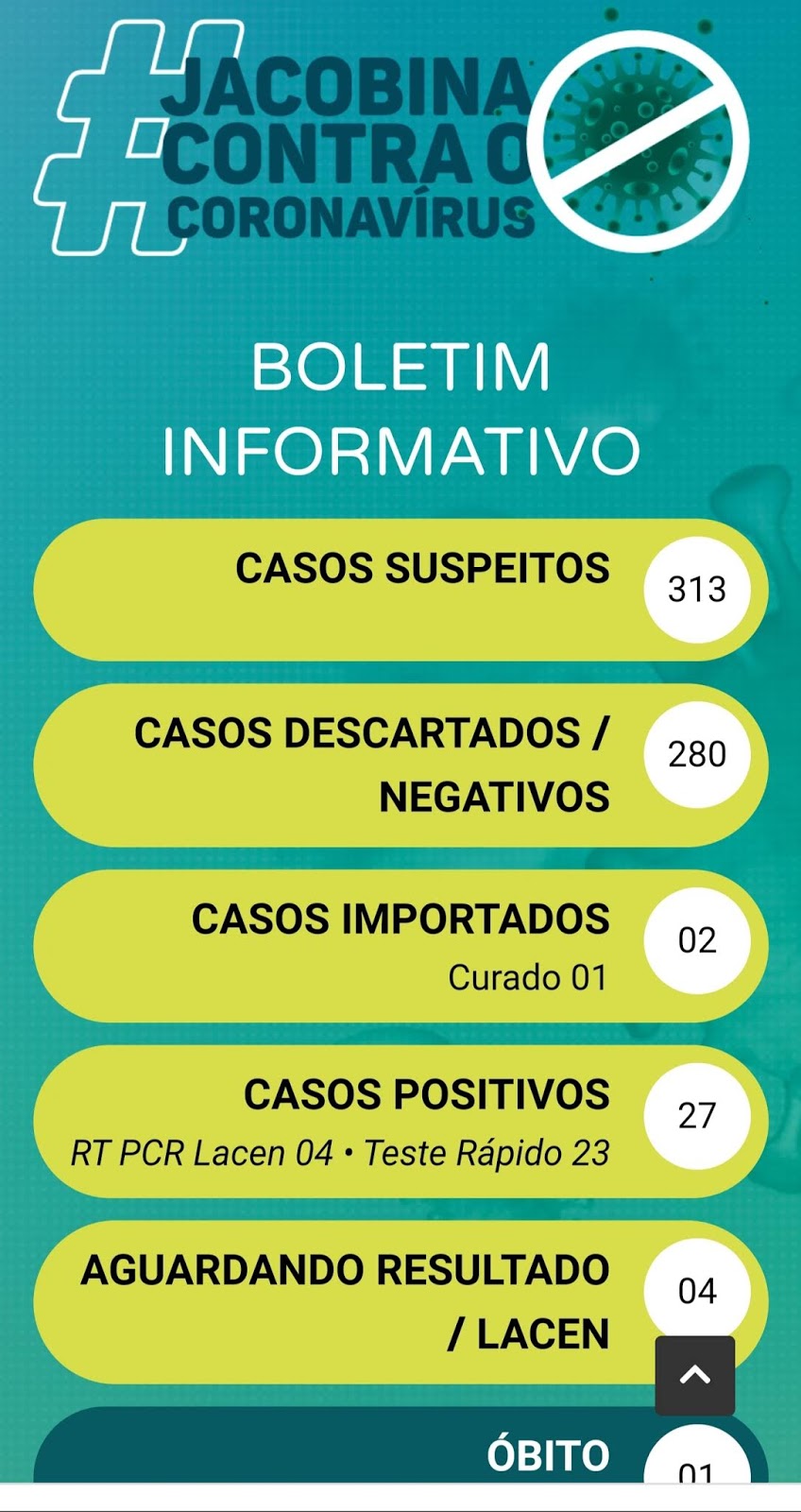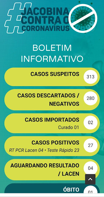 Na na manhã desta segunda-feira, 18 de maio de 2020, a Secretaria de Saúde anunciou através de boletim que o município de Jacobina registrou mais 4 casos de Coronavírus no município e agora o total é de 27 infectados.