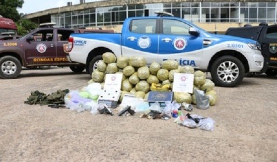 Nos imóveis usados pela quadrilha foram apreendidos uma pistola calibre 45, um simulacro de pistola, carregador, munições de diversos calibres, duas câmeras, balanças, embalagens plásticas, roupas camufladas, nove celulares, entre outros materiais. Em uma área de mata fechada, o farejador Titan, da raça Labrador, da Companhia de Operações com Cães (COC) do Batalhão de Choque encontrou 100 kg de maconha em uma casa.
