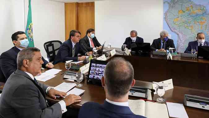 O presidente Jair Bolsonaro juntamente com o presidente da Câmara dos Deputados, Rodrigo Maia e o presidente do Senado, Davi Alcolumbre se reuniram com governadores de todo o país por meio de videoconferência nesta quinta-feira (21/05) para tratar sobre a sanção do projeto de lei que cria o Programa Federativo de Enfrentamento ao Coronavírus, que auxiliará os estados no enfrentamento ao covid-19. Durante a reunião, que durou pouco mais de uma hora, Bolsonaro disse que deverá sancionar ainda nesta quinta-feira (21) o auxílio aos estados. Ele pediu ainda aos governadores apoio para o congelamento de salários de servidores públicos até o dia 31 de dezembro de 2021, o que foi aceito com unanimidade entre os líderes estaduais.