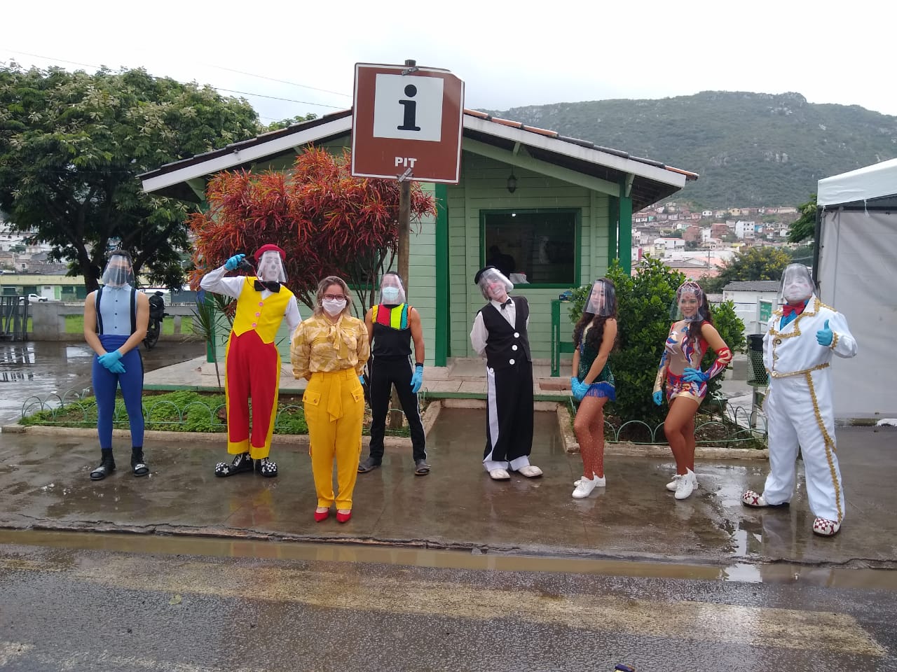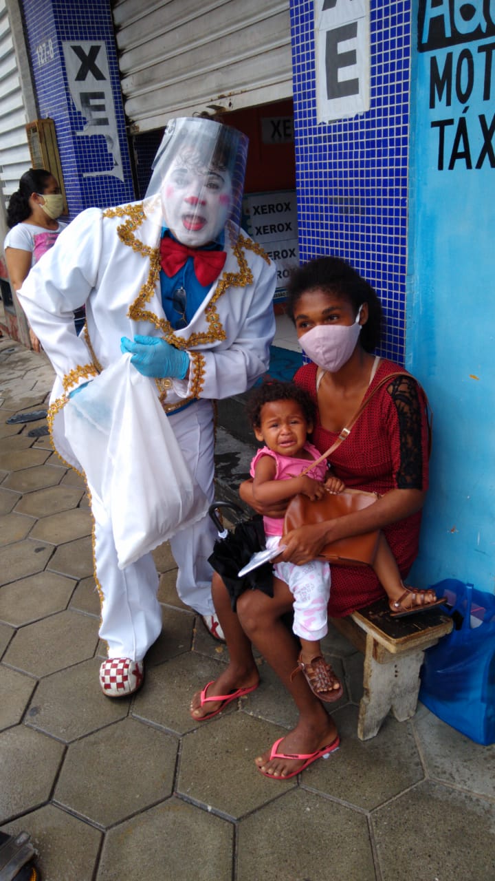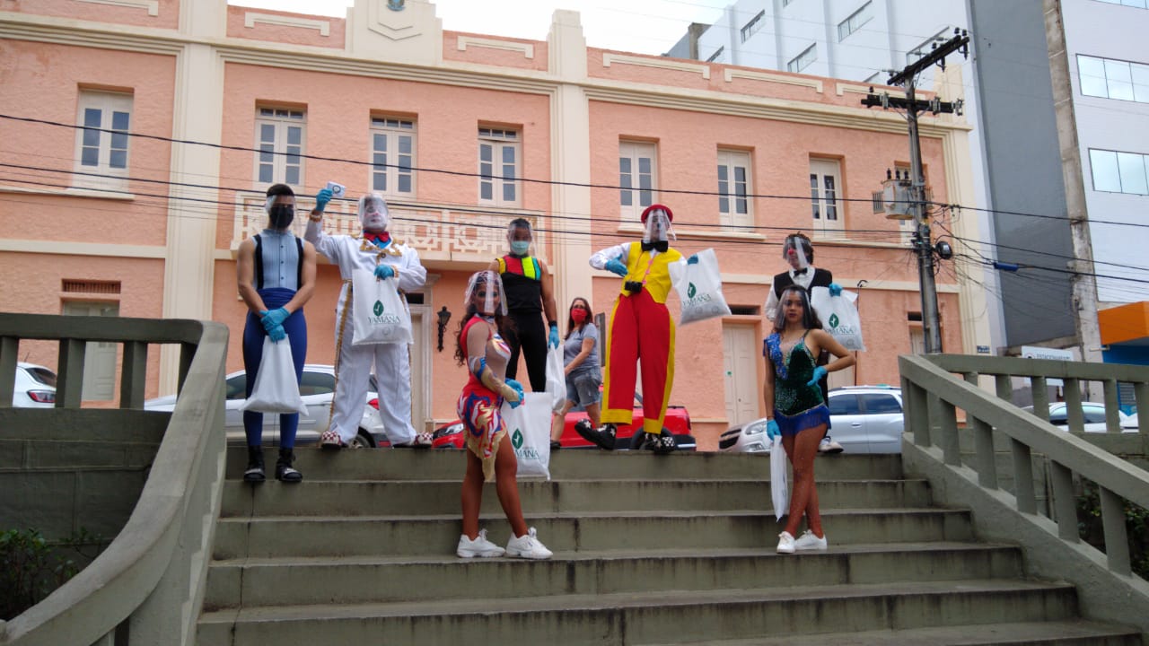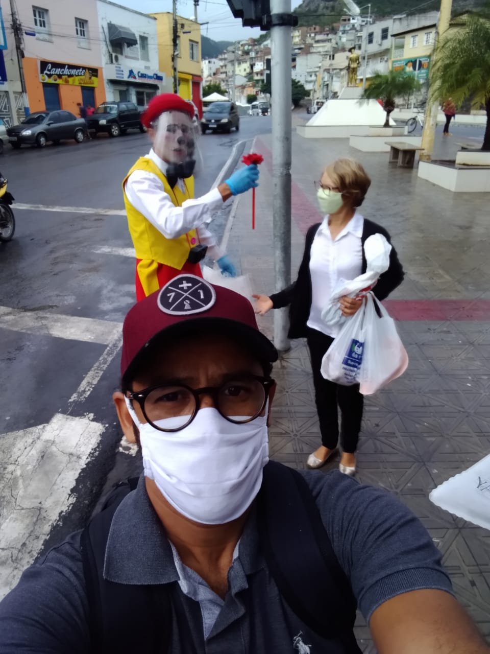 Na manhã desta quinta-feira, 28 de maio de 2020, artistas do Circo Marcos Frota Show seguem doando máscaras pelas ruas da cidade de Jacobina,  em uma ação realizada pela Yamana Gold.