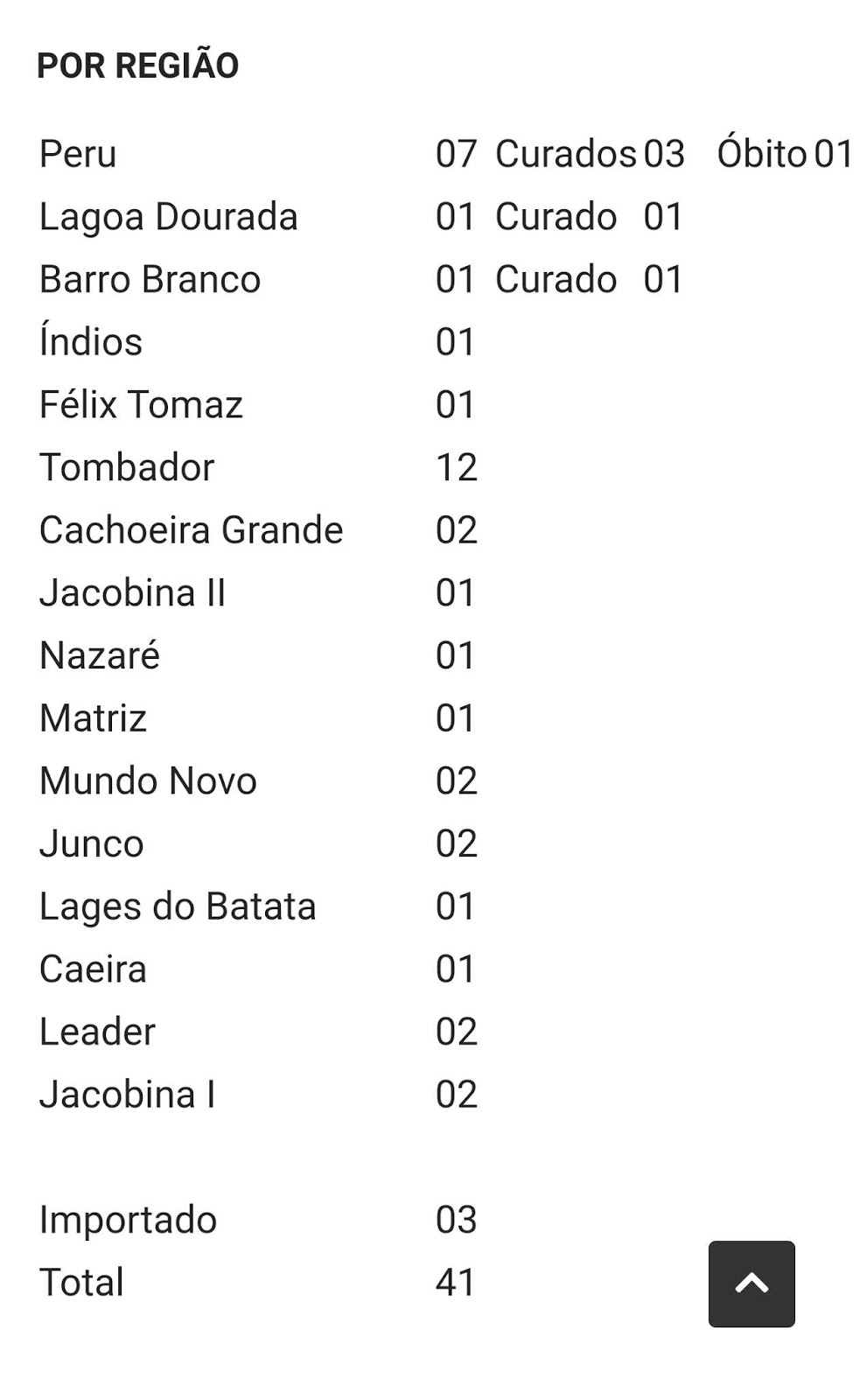 Os registros dos novos casos ocorrem no Bairro da Caeira com 01 infectado e os bairros do Leader e Jacobina I que também aparecem pela primeira vez no boletim, ambos com 02 casos. O município registra 01 óbito e 06 pessoas aguardam resultados do Lacen.