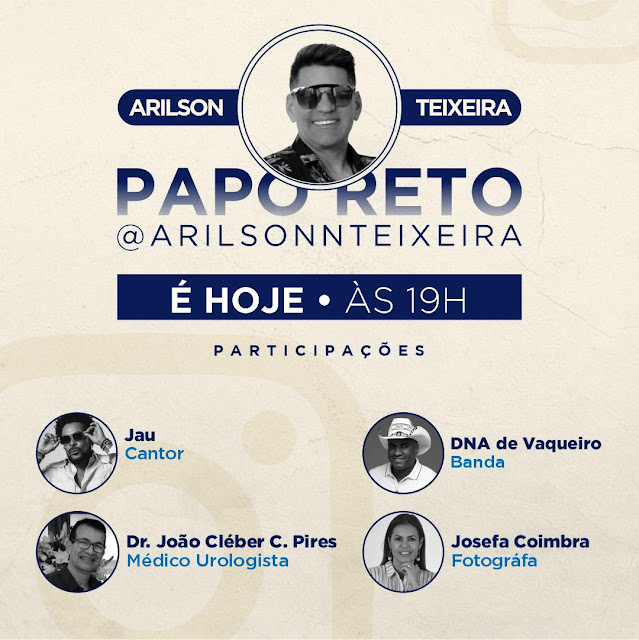 A partir das 19h desta quinta-feira, 28 de maio de 2020, Arilson Teixeira estará apresentando a live Papo Reto pelo Instagram. Para tratar sobre saúde e cultura em tempos de pandemia, Arilson contará com as participações dos cantores Jau, DNA de Vaqueiro, da fotografa Josefa Coimbra e do médico urologista Dr João Cleber.