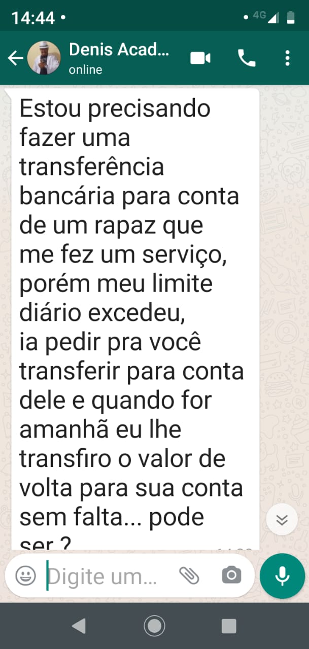 Pessoas começaram a receber mensagens como se fosse passadas por Denis, que estava sem limite no seu cartão, pedindo para o amigo fizesse uma transferência a conta de um rapaz para pagar um serviço, que no dia seguinte lhe devolveria o valor também através de transferência.