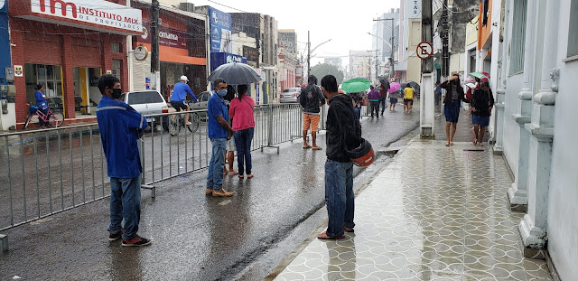 Na manhã desta quinta-feira, 04 de junho de 2020, o povo enfrenta a chuva em uma fila na Rua Senador Pedro Lago em Jacobina, para sacar o auxílio emergencial na Caixa Econômica Federal, liberado pelo Governo Federal para os trabalhadores no período da pandemia do Covid-19.