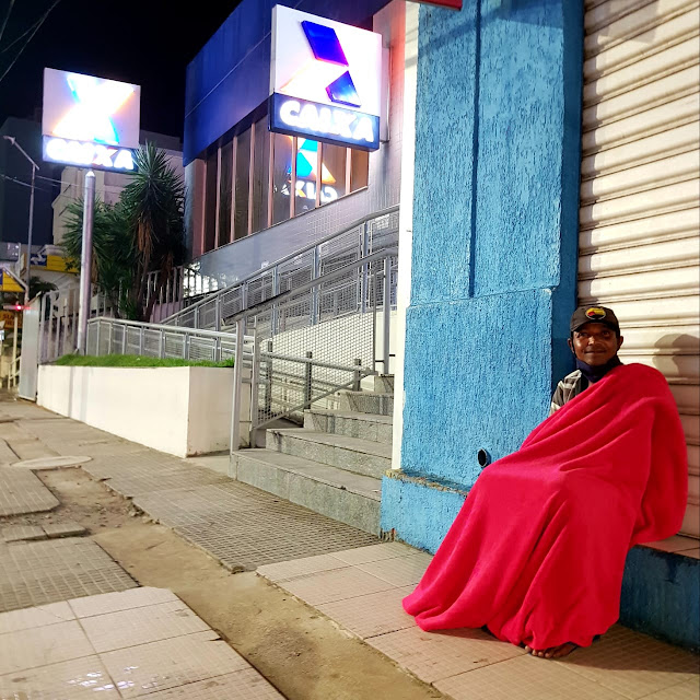 Com o aumento da procura pelos serviços bancários, depois dos pagamentos das parcelas do benefício emergencial do Governo Federal, Picolé tem passado suas noites literalmente no 'relento', curtindo um frio que faz jus ao seu apelido, a fim de conseguir alguém que pague pelo 'lugar' reservado pelo mesmo.