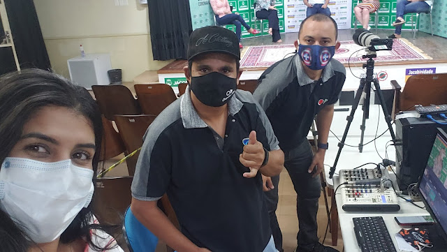 O trio trabalha na transmissão da Live Saúde em Foco, onde o diretor de comunicação Clayton Luz fala com a técnica de enfermagem Suelane Lima, que se contaminou e está curada do Coronavírus.