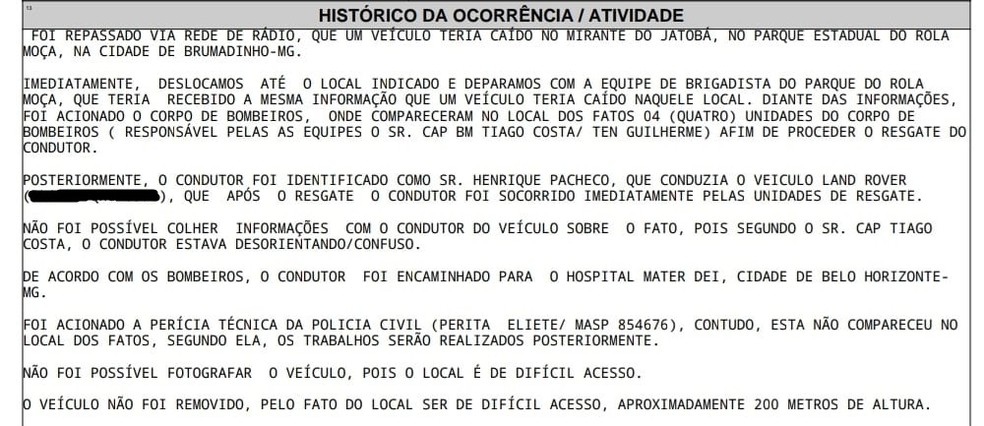 Ainda de acordo com o documento, a PM foi acionada via rede de rádio e teve apoio de quatro viaturas do Corpo de Bombeiros para socorrer a vítima. O acidente aconteceu por volta de 18h e o jogador foi levado para o hospital por volta de 22h. O local, segundo os militares, é difícil acesso e por isso o carro do jogador, uma Land Rover, não foi retirado do penhasco até a publicação desta reportagem.