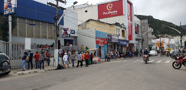 Na manhã desta sexta-feira, 03 de julho de 2020, pessoas seguem em uma fila na Rua Senador Pedro Lago em Jacobina, para atendimento na Caixa Econômica Federal.