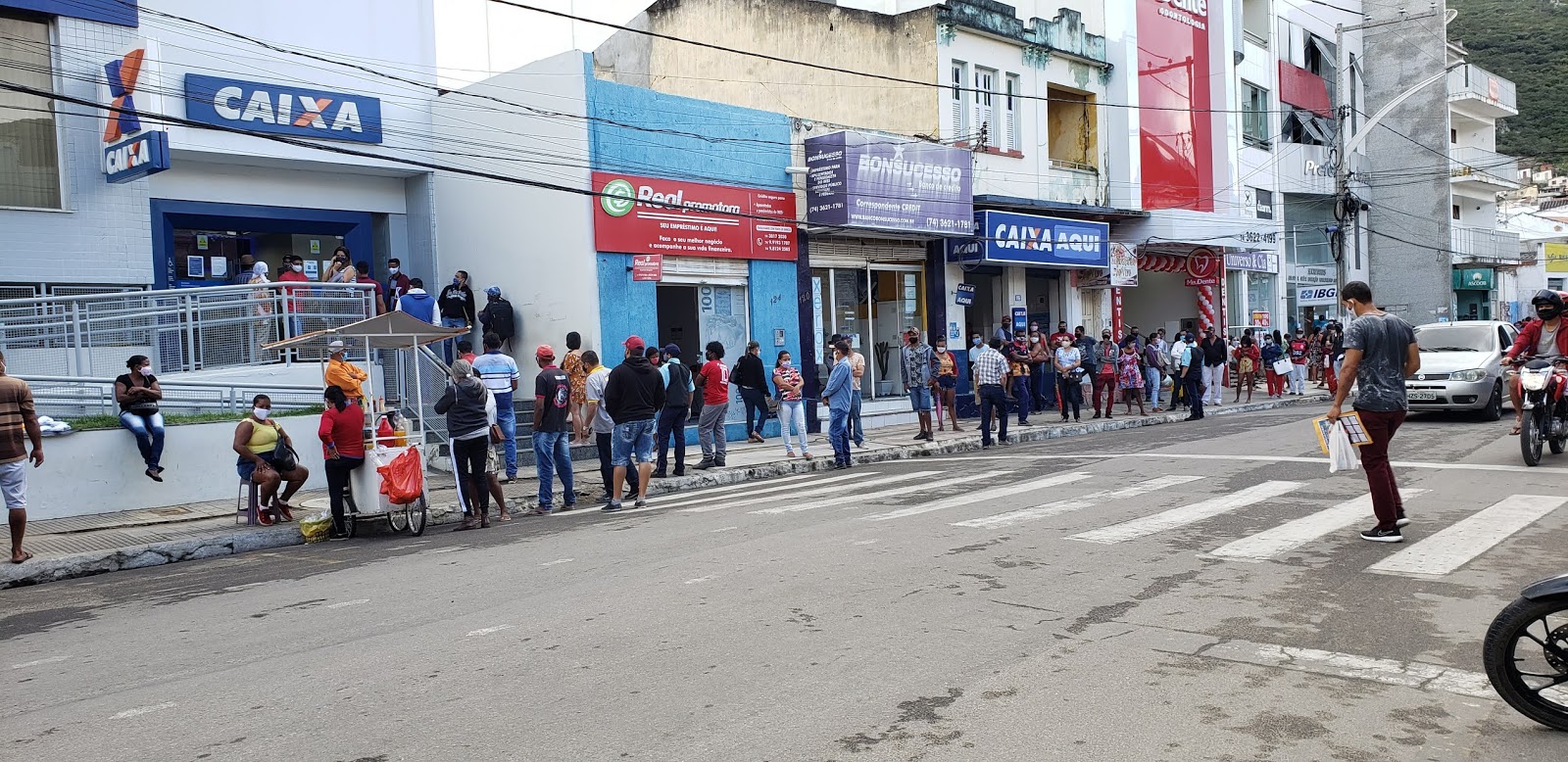 Na manhã desta segunda-feira, 06 de julho de 2020, pessoas seguem em uma fila na Rua Senador Pedro Lago em Jacobina, para atendimento na Caixa Econômica Federal.