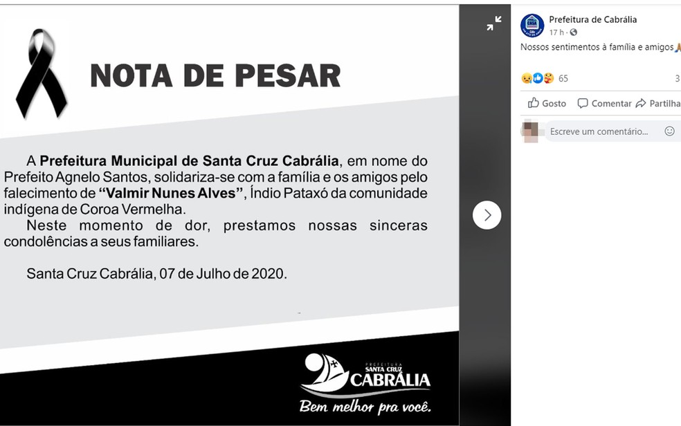 O idoso morreu e foi enterrado na terça-feira (7). Não há detalhes se ele sofria de alguma comorbidade. De acordo com o secretário Juari Pataxó, Valmir estava internado há cerca de duas semanas no Hospital Luís Eduardo Magalhães, em Porto Seguro, cidade a cerca de 22 km de Santa Cruz Cabrália. A primeira morte de indigena por Covid-19 registrada no sul da Bahia ocorreu em maio e foi de um idoso da aldeia Tupinambá de Olivença, na cidade de Ilhéus.
