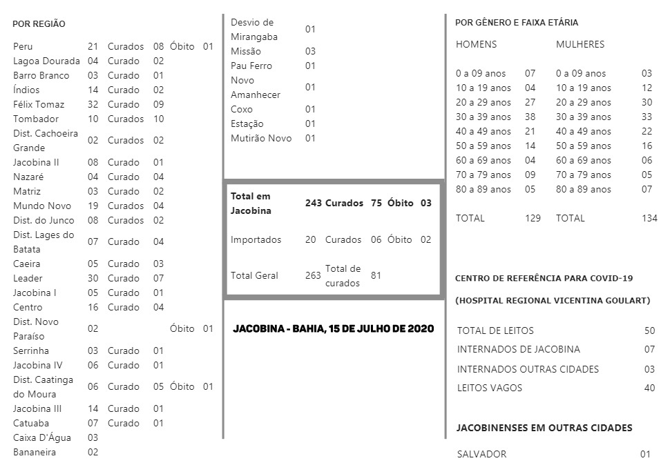 Nesta quarta-feira, 15 de julho de 2020, a Secretaria de Saúde atualizou o boletim epidemiológico com mais 05 casos positivos de Coronavírus e o total agora é de 263 infectados no município de Jacobina.