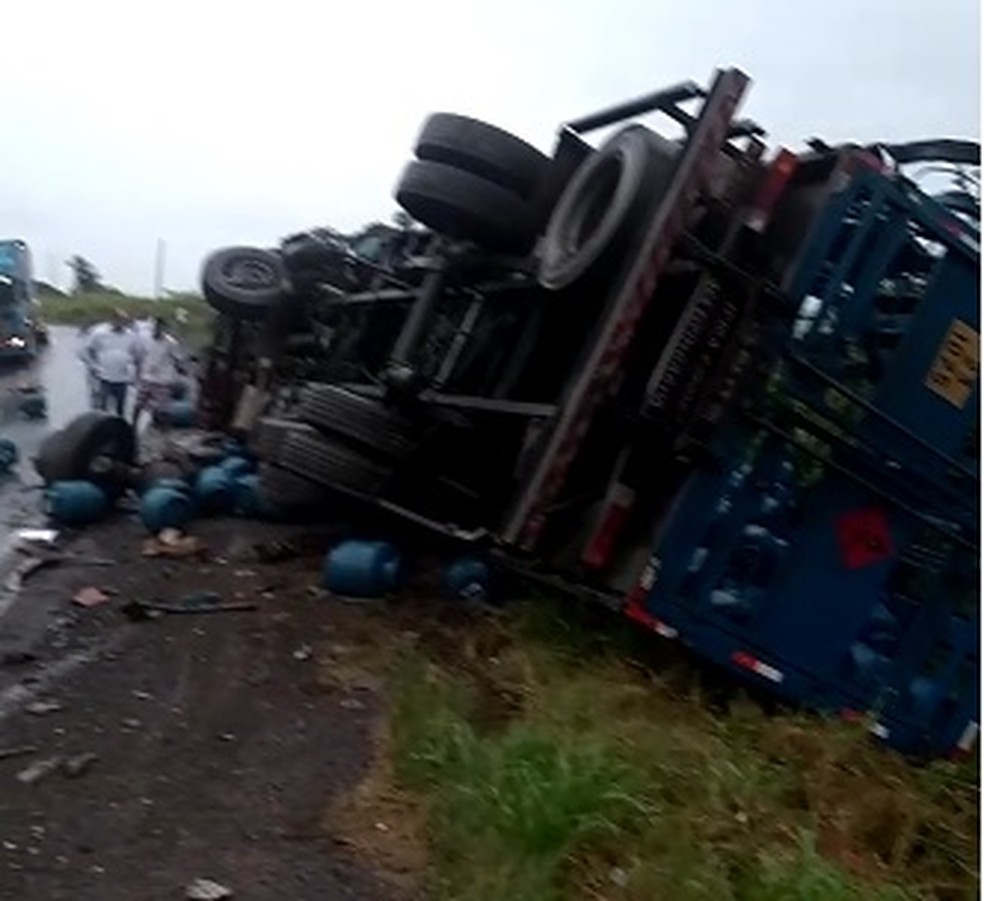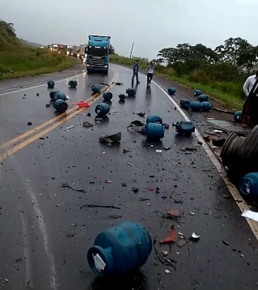 Conforme a Polícia Rodoviária Federal (PRF), o acidente aconteceu por volta das 17h, no KM 134. A caçamba ficou destruída. Botijões de gás ficaram espalhados pela pista.