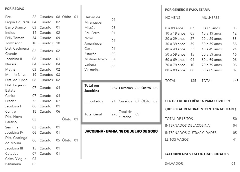Neste sábado, 18 de julho de 2020, a Secretaria de Saúde de Jacobina atualizou o boletim epidemiológico com mais 5 casos de coronavírus e o município passa a ter 278 positivos, com 82 curados e 172 estão com o vírus em monitoramento residencial e hospital.