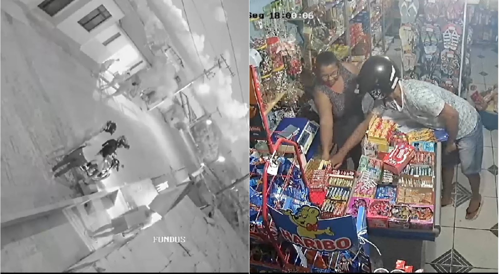As imagens mostram os elementos armados tomando de assalto celulares de mulheres na porta de uma residência. Na sequência um dos elementos com uma arma adentra um mercadinho e leva uma quantia em dinheiro do caixa.