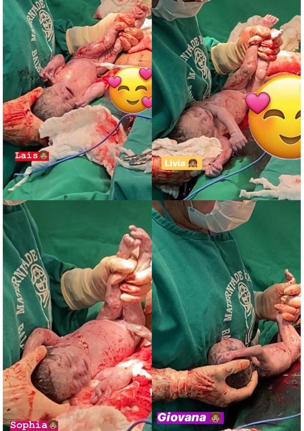 A equipe médica se preparou para a cesárea das trigêmeas e também levou um susto ao achar a quarta "escondida" na barriga da mãe. Giovana nunca tinha aparecido em nenhum dos ultrassons durante a gravidez.