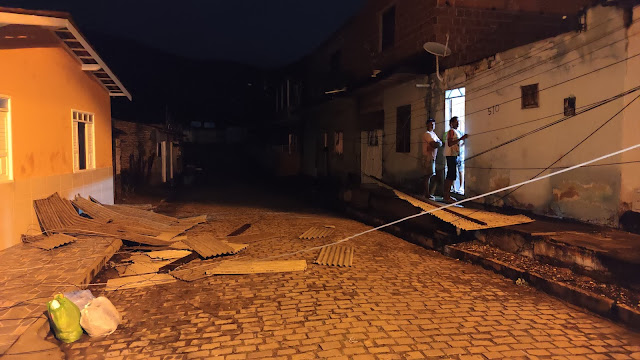 Parte do madeiramento do telhado também foi arrancado e arremessado interrompendo a energia elétrica da rua, caindo também sobre outras casas.