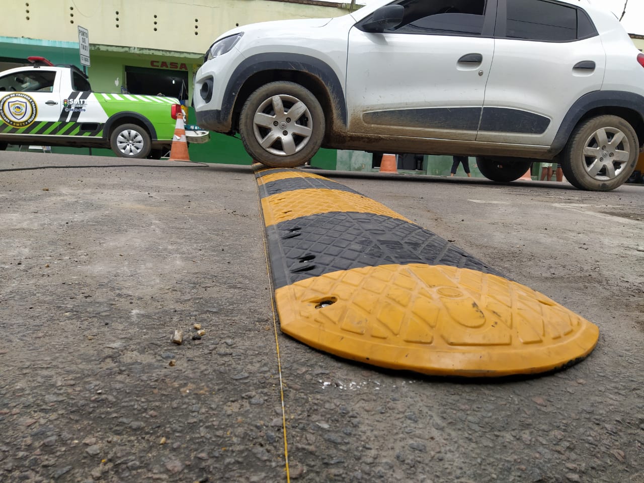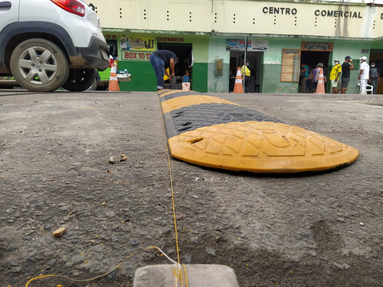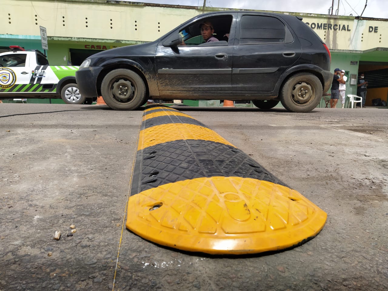 O Serviço Municipal de Tráfego e Transportes (SMTT) implantou, nesta quarta-feira (5), uma lombada emborrachada na Praça Presidente Getúlio Vargas, em frente ao Mercado Velho, no centro de Jacobina. No local, haviam tachões instalados para uso como redutor de velocidade, o que estava em desacordo com a Resolução 336 do Conselho Nacional de Trânsito (Contran). A nova lombada implantada pelo SMTT segue as normas do Contran e foi produzida em ferro na parte interna com cobertura de borracha, para reduz o impacto quando em contato com os pneus dos veículos.
