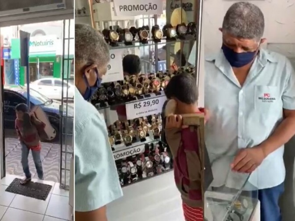 "Você tá trabalhando e vai comprar um relógio pro seu pai?", pergunta o proprietário do estabelecimento, Paulo César da Silva, que postou o vídeo no Facebook. O garoto afirma e é elogiado pelo homem que prontamente prepara a mercadoria para o menino levar.