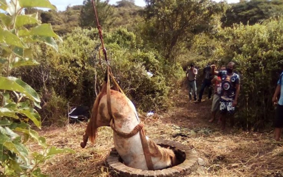 O animal teve ferimentos leves e foi retirado do poço com ajuda de um caminhão munck, também conhecido como guindauto, veículo que possui um equipamento capaz de carregar e movimentar grandes cargas.