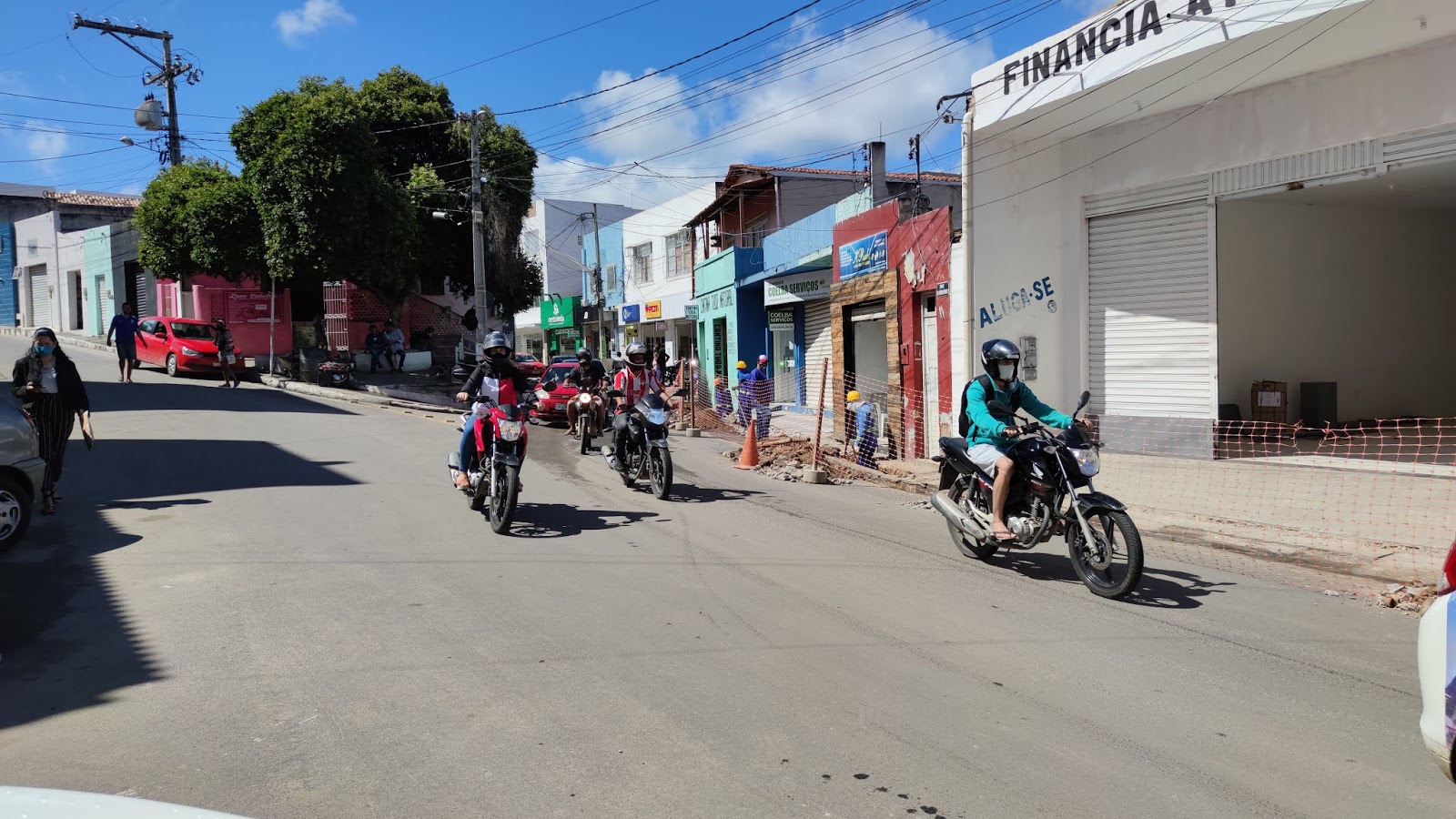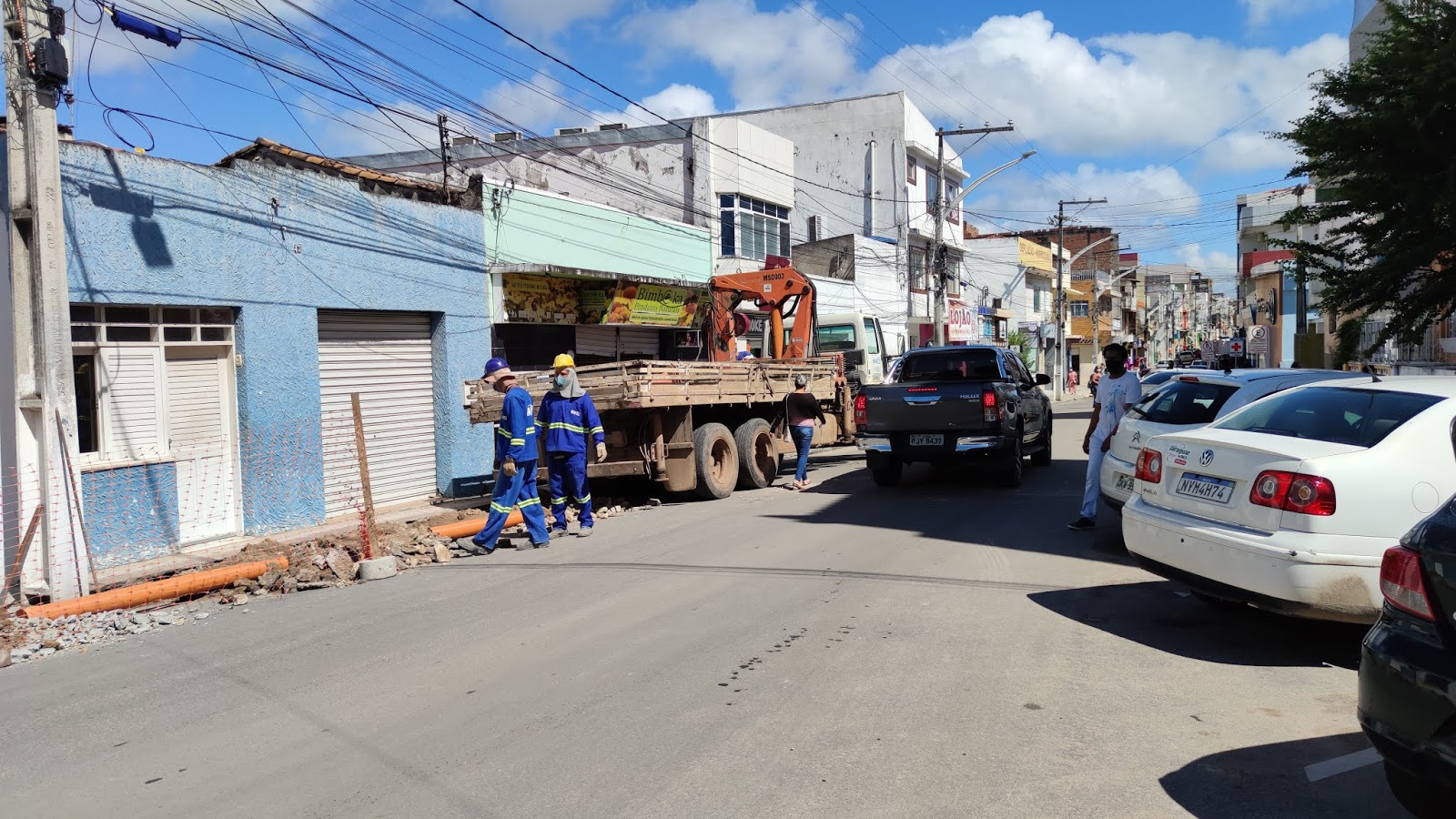 A calçada segue sendo aberta e um caminhão descarrega manilhas interrompendo a via por alguns instantes, materiais que serão adicionadas para a conclusão de mais uma rede central.