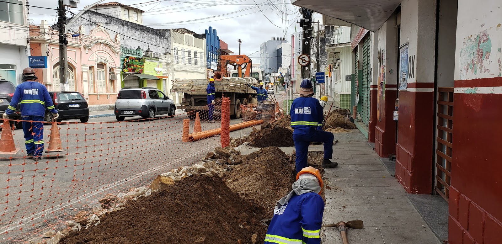 Logo próximo, outra equipe trabalha abrindo a calçada da Rua Senador Pedro Lago, esquina com a Praça Castro Alves.