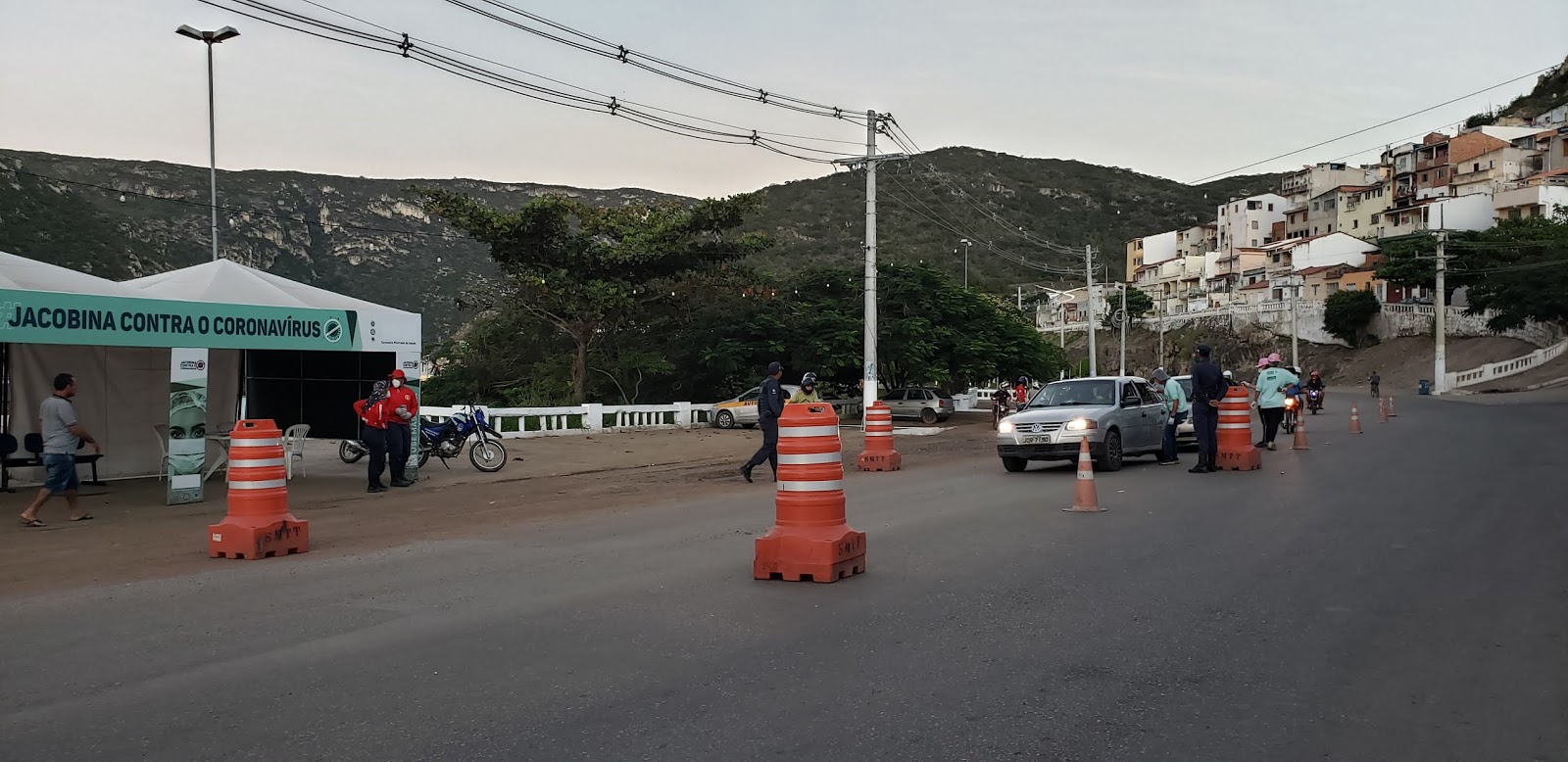 Final da tarde de domingo, 16 de agosto de 2020, e aqui na Rua Landulfo Alves em Jacobina, uma equipe formada pela Guarda Municipal, Bombeiros Civis e Vigilância Epidemiológica segue atuando na barreira sanitária de combate ao Coronavírus.