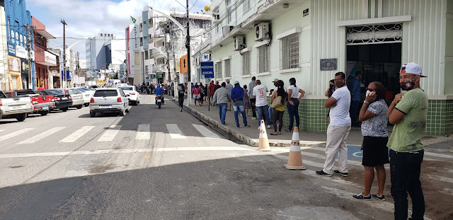 Na manhã desta segunda-feira, 17 de agosto de 2020, centenas de seguem em uma fila na Rua Senador Pedro Lago em Jacobina, pra atendimento na Caixa Econômica Federal.