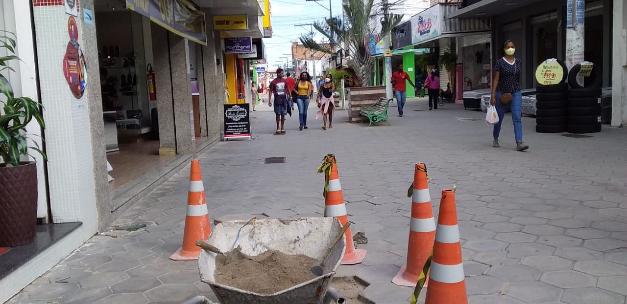 Na manhã desta quinta-feira, 20 de agosto de 2020, prepostos do Setor de Obras realizam reparos no piso intertravado do Calçadão de Jacobina.