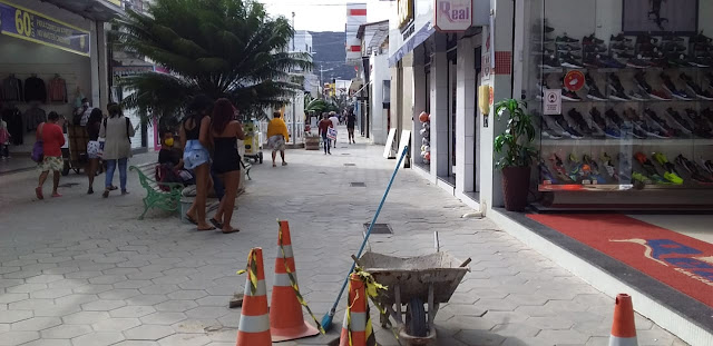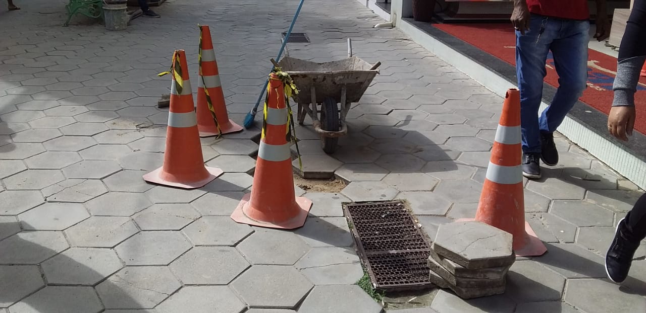 O serviço é feito atendendo os comerciantes e transeuntes, após pessoas sofrerem queda devido a uma depressão no piso, o afundamento de alguma pedras.