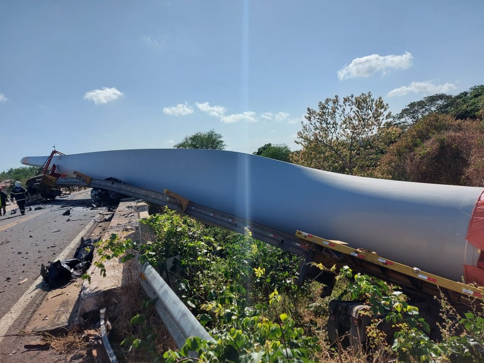No acidente, a carreta chegou a sair da pista e a hélice ficou atravessada na rodovia. Não há informações sobre o que causou o acidente.