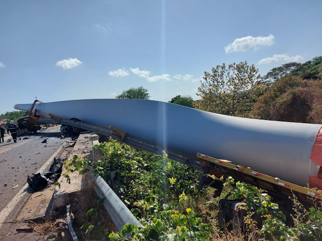 O caminhão que levava o equipamento bateu de frente com um carro de passeio neste domingo (30). Os dois homens morreram após o carro em que estavam ser esmagado pela pá eólica que estava sendo transportada por uma carreta no município de Parambu, na localidade de Pau Preto, em uma ponte sobre o Rio Puiú.