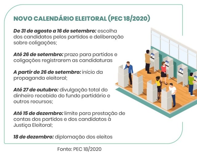 Antes previstas para outubro, as Eleições Municipais deste ano foram adiadas pelo Congresso Nacional por causa da pandemia da Covid-19. O pleito está marcado para os dias 15 de novembro e 29 de novembro, datas do primeiro e segundo turno, respectivamente.