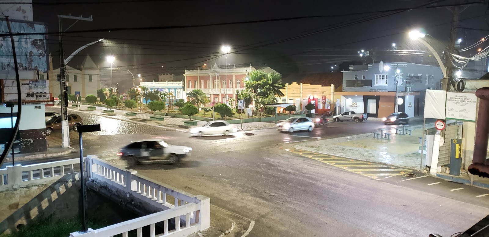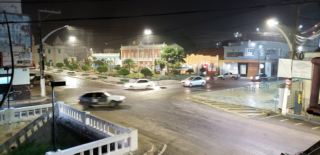 Início da noite de sábado, 05 de setembro de 2020, e aqui observamos uma fina chuva que cai na Praça Castro Alves em Jacobina.