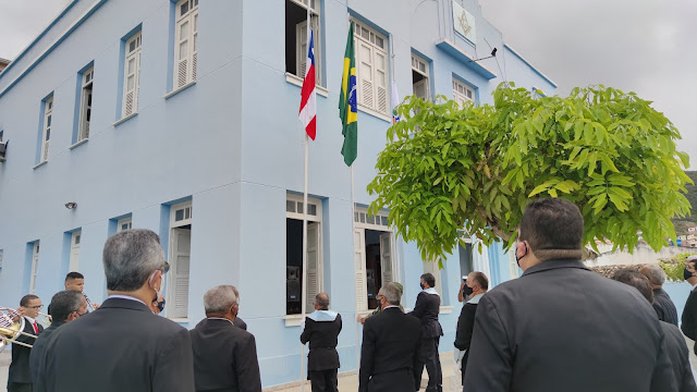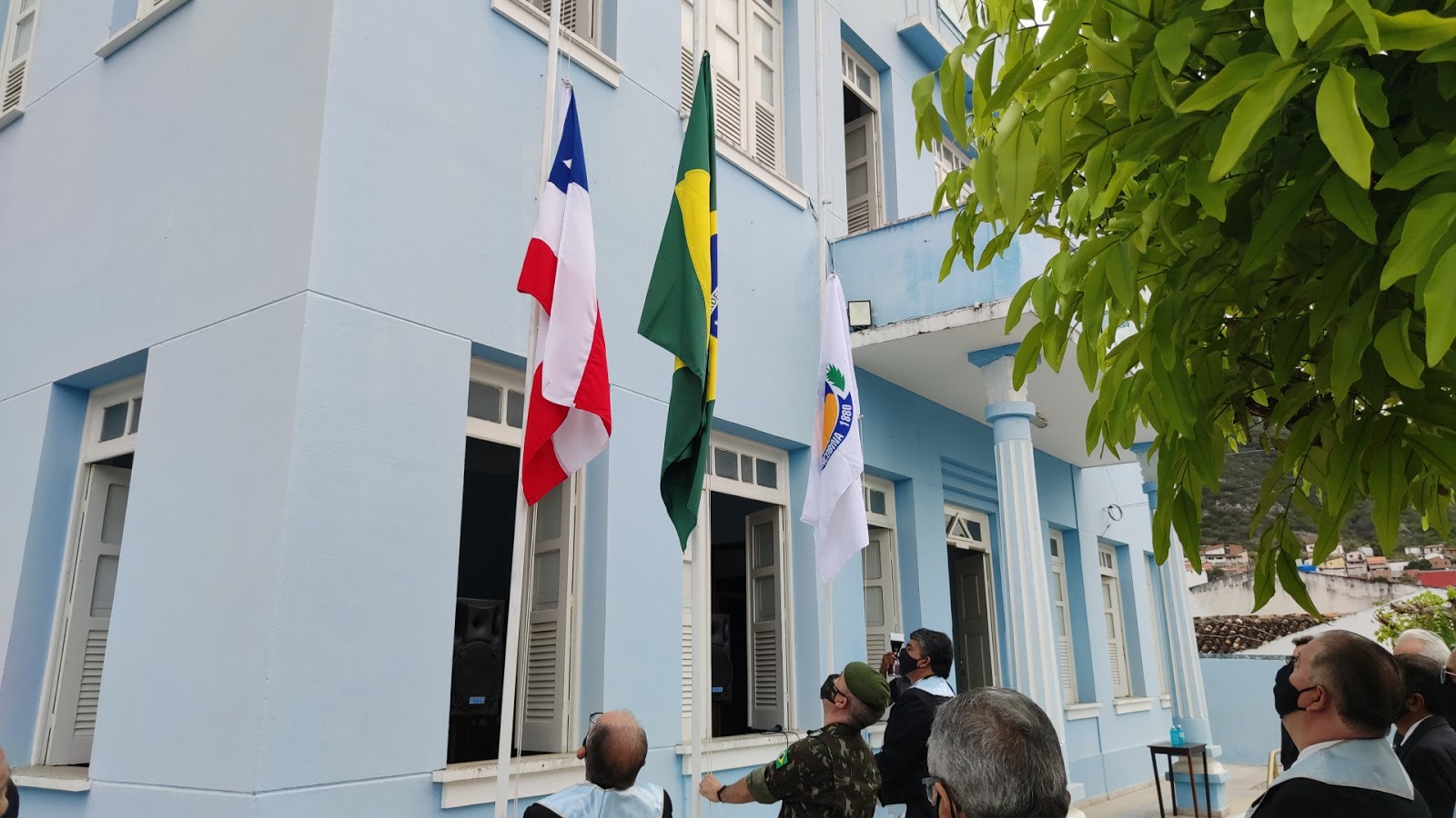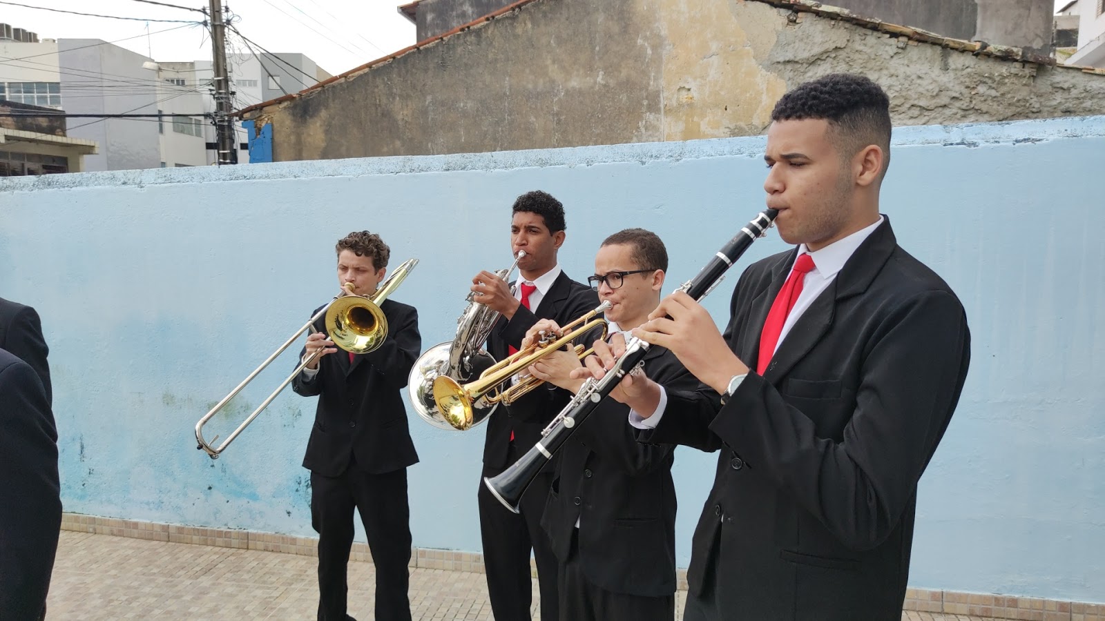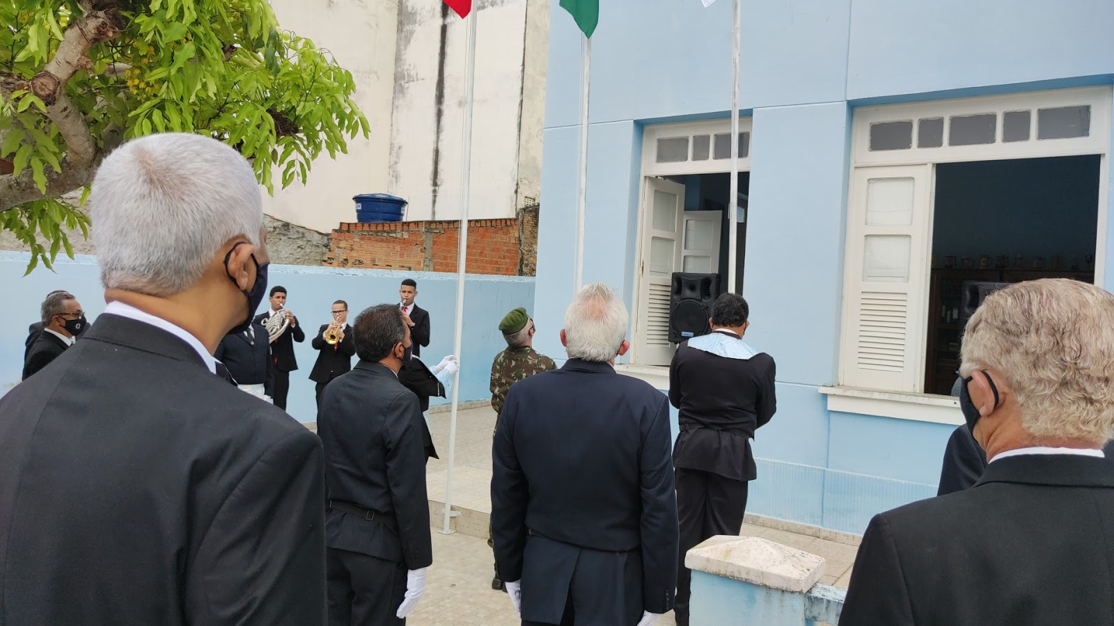 Integrantes da Filarmônica 2 de Janeiro executam o Hino Nacional e o evento conta também com as presenças da Polícia Militar, do Subtenente Fagundes do Tiro de Guerra e do psicólogo Manuel Braz representando o prefeito Luciano Pinheiro.