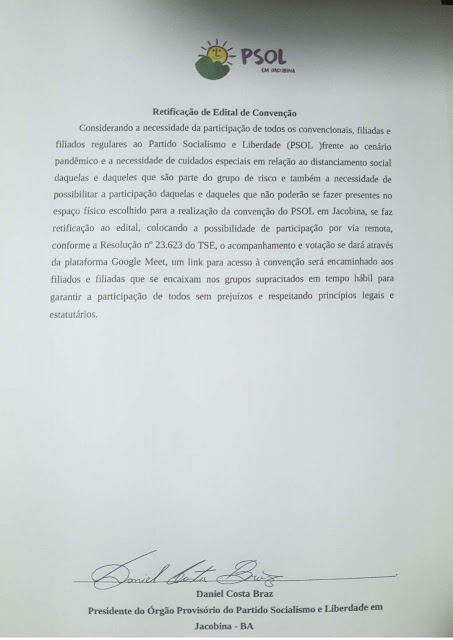 Considerando a necessidade da participação de todos os convencionais, filiadas e filiados regulares ao Partido Socialismo e Liberdade (PSOL) frente ao cenário pandêmico e a necessidade de cuidados especiais em relação ao distanciamento social daquelas e daqueles que são parte do grupo de risco e também a necessidade de possibilitar a participação daquelas e daqueles que não poderão se fazer presentes no espaço físico escolhido para a realização da convenção do PSOL em Jacobina, se faz retificação ao edital, colocando a possibilidade de participação por via remota, conforme a Resolução nº 23.623 do TSE, o acompanhamento e votação se dará através da plataforma Google Meet, um link para acesso à convenção será encaminhado aos filiados e filiadas que se encaixam nos grupos supracitados em tempo hábil para garantir a participação de todos sem prejuízos e respeitando princípios legais e estatutários.