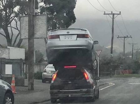 Talvez nunca nenhum de nós tenha testemunhado uma cena tão estranha no trânsito. A região de Lower Hutt, na Nova Zelândia, foi palco de um "reboque" bastante diferente do que estamos acostumados. Na verdade, não era um reboque, era apenas uma perua Toyota levando outro automóvel no teto.
