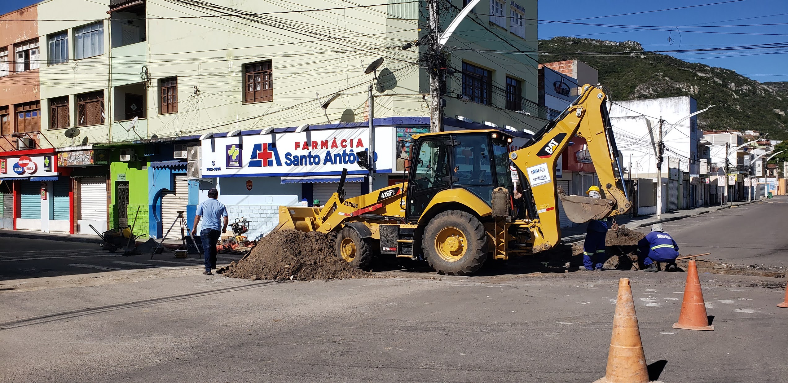 Homens e maquinas trabalham no sistema de esgotamento sanitário no centro de Jacobina