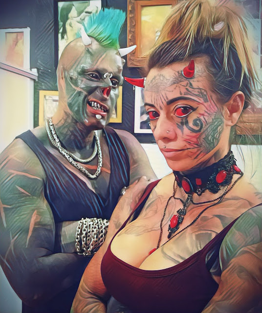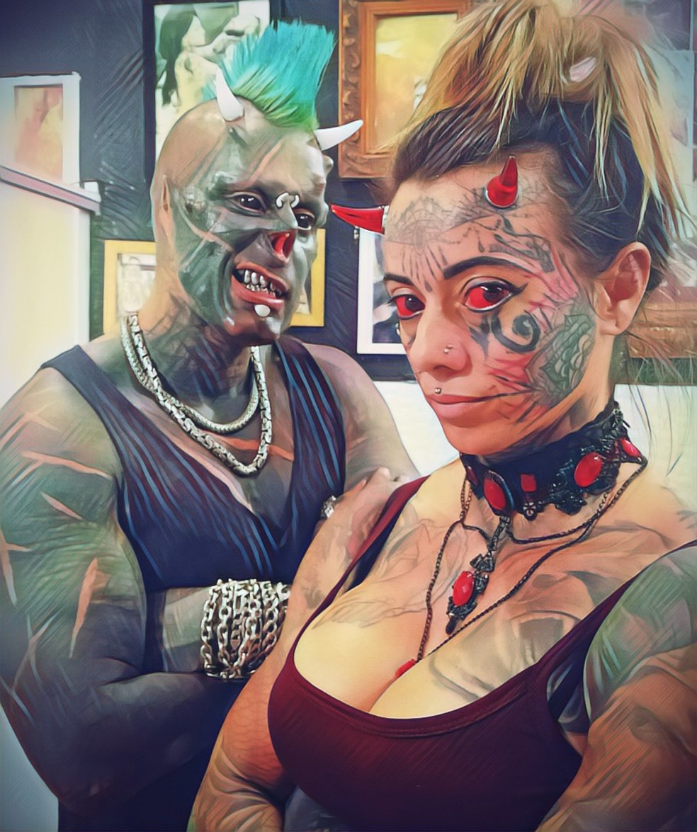O casal de modificadores mora em Praia Grande, no litoral de São Paulo, e está junto há 11 anos. Carol tem cerca de 60% do corpo tatuado, além de alterações na língua, testa, dentes e olhos. Já Diabão, tem 85% da pele coberta por tatuagens e modificações parecidas com as da esposa, como chifres e dentes alongados, além das carnificações como remoção das orelhas e do nariz.