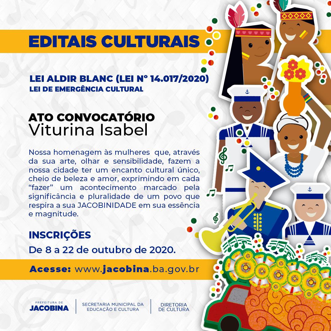 A Prefeitura de Jacobina, por meio da Secretaria Municipal da Educação e Cultura, via Diretoria de Cultura, abre inscrições para que trabalhadores e trabalhadoras da cultura possam solicitar o subsídio mensal vinculado à Lei “Aldir Blanc” (Lei nº 14.017/2020), viabilizando a manutenção de espaços artísticos e culturais, microempresas e pequenas empresas culturais, instituições, grupos e organizações culturais comunitárias que tiveram as suas atividades interrompidas por força das medidas de isolamento social, no município de Jacobina.